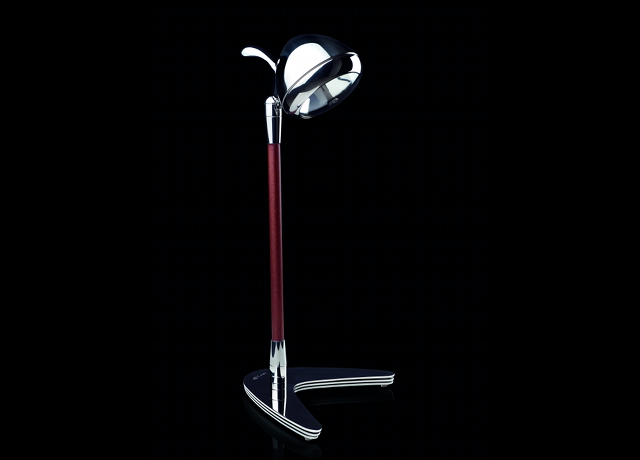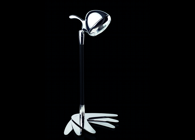 On top of the “searching light” itself, the stem and the base also clearly recall the elegance and sobriety of Riva boats: the stem is available in mambo (the fabric used for the upholstery) or in mahogany, two characteristic materials used on the vessels, while the base, made of three overlaid sections of steel, recalls the famous bow of the Aquarama and Aquariva motorboats, and once opened it recalls a boat’s propeller.