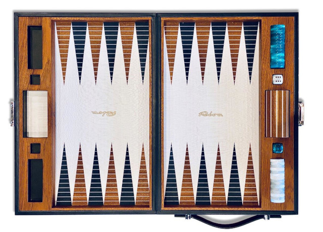 The white and aquamarine dice and pieces have mahogany inlays and show the same passion for detail that makes the world’s most coveted yachts so inimitable.