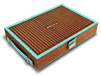 The Riva Backgammon set isn’t just a game but a genuine work of art available in two versions: one with an exterior covering in aquamarine mambo fabric and the other in blue leather. In both cases, the mahogany and maple construction is a jewel of craftsmanship, with a steel Riva logo either inlaid or, in the more luxurious leather model, with a “transparency” effect.
