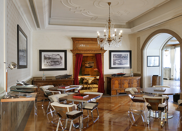 Nessa localização única, o mobiliário e a decoração transportam imediatamente o hóspede para a magia do mito Riva. Em especial, o calor da madeira envolve o hóspede em uma série de intársias, marchetarias, essências e detalhes requintados. Os cromos, o aço, o mogno laqueado, a típica linhas dos decks dos iates, são elementos peculiares, típicos do mito Riva que, apenas com um olhar, remetem para o design e o esplendor dos iates mais famosos do mundo.